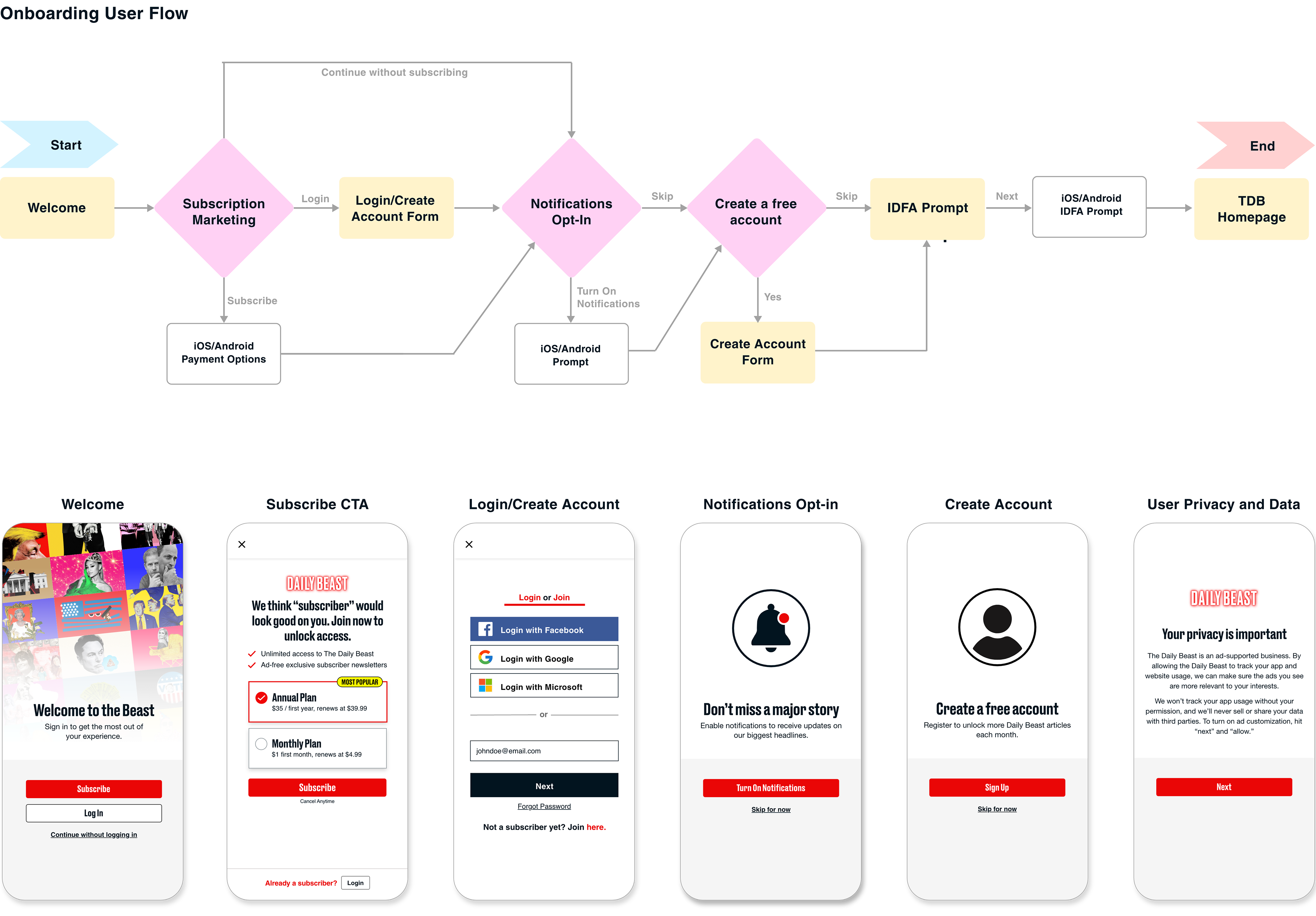 Designed an onboarding flow to welcome new users, introduce key offerings, and guide them through subscribing or creating an account. The experience focused on clarity and ease, helping users quickly personalize their profile, notifications, and data settings.