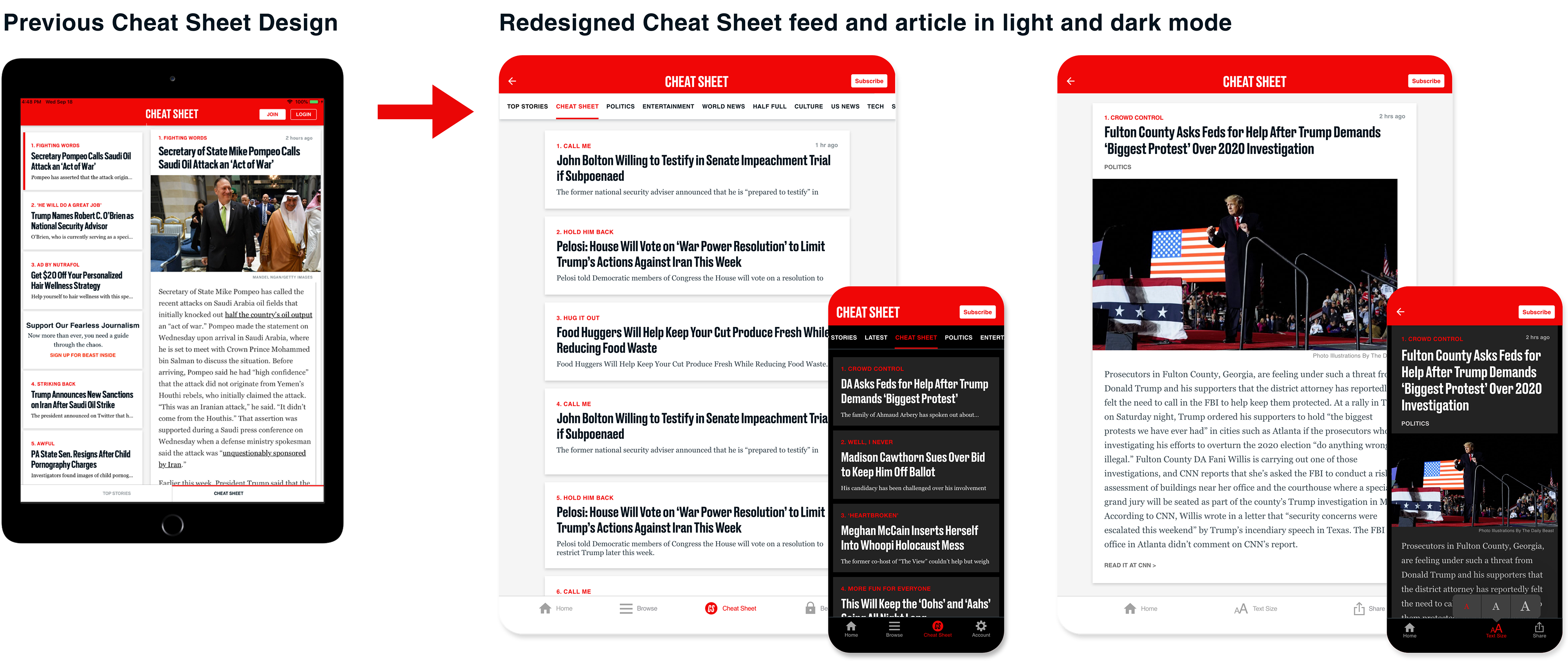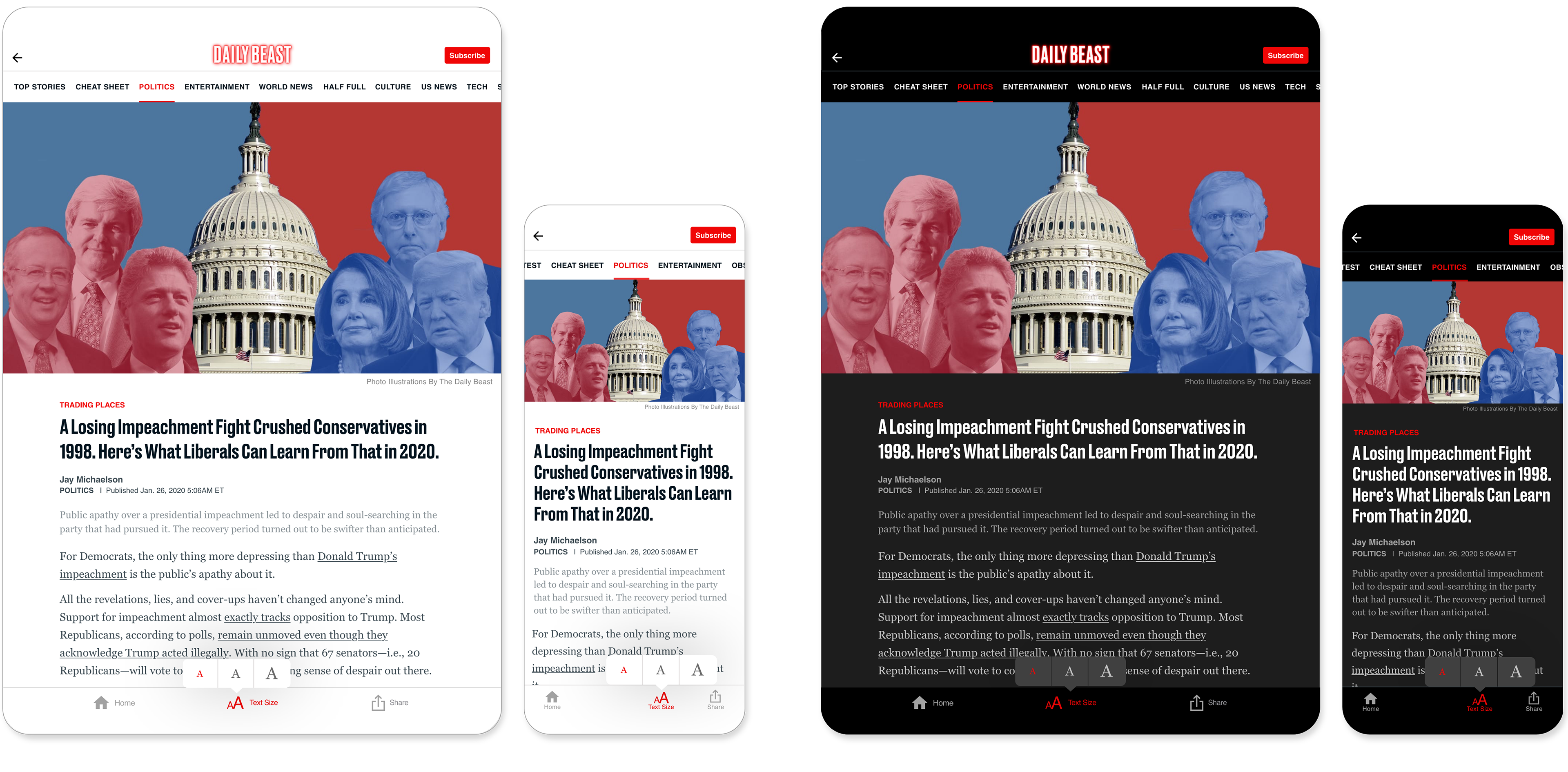Redesigned the article experience across mobile and tablet to feel more premium and immersive. Introduced light and dark modes, improved typography with adjustable font sizing, and expanded the overall reading layout. This redesign fixed tablet layout issues and created a larger, more comfortable reading experience.
