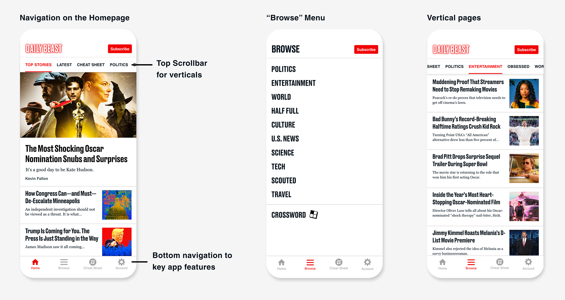 Improved navigation by adding a top scrollbar for quick access to vertical pages and introducing a bottom navigation bar to make key features easier to find. Also added a dedicated “Browse” menu, allowing users to access individual pages for each vertical, making it easier to quickly find the specific content they want.