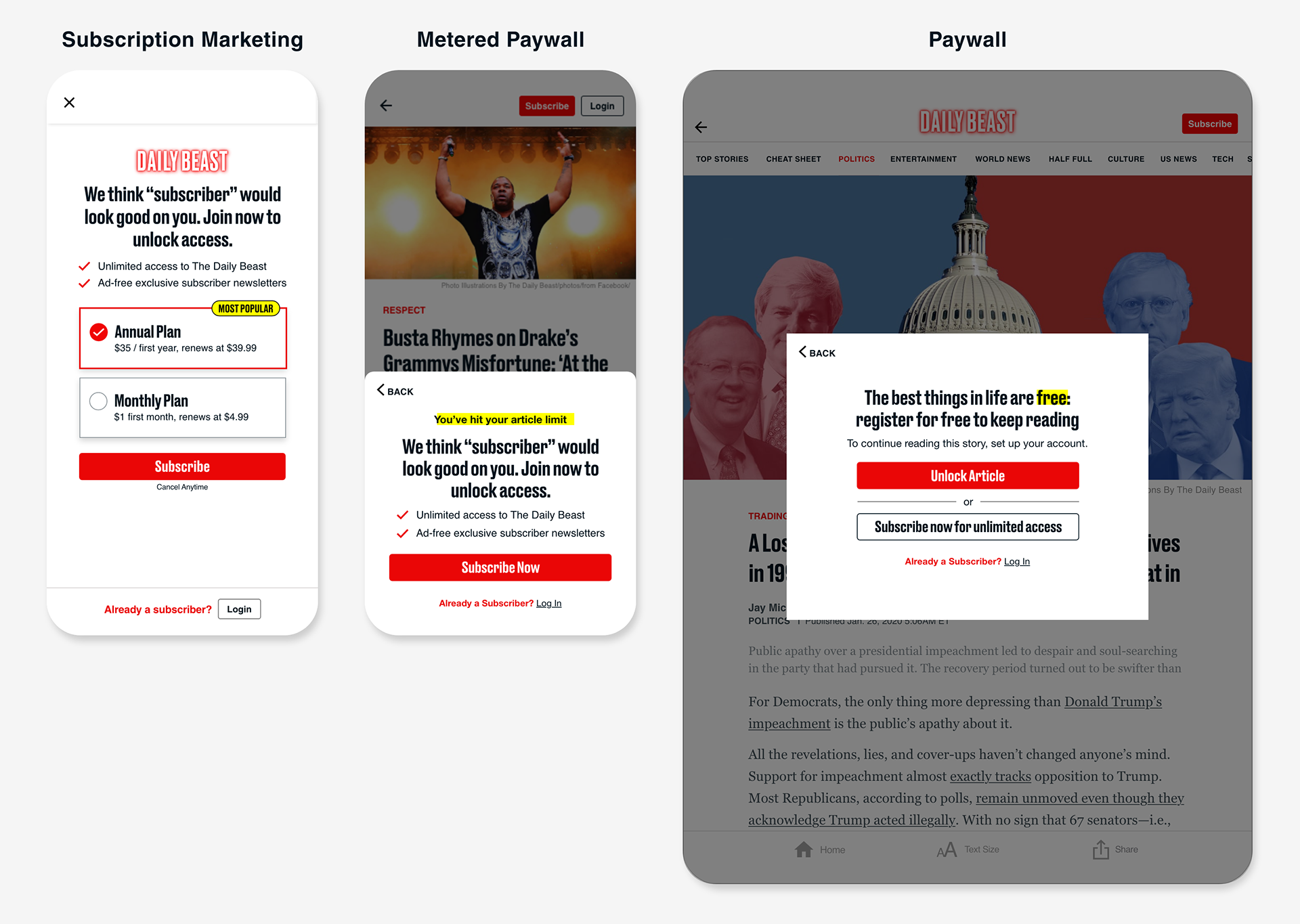 Designed account and subscription experiences, including paywall gating and subscriber-only flows. Considered multiple user states, including registered, subscribed, and non-registered, to guide users toward conversion with a clear, intuitive experience.